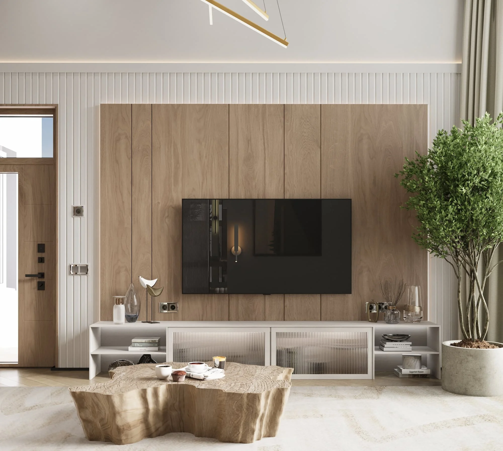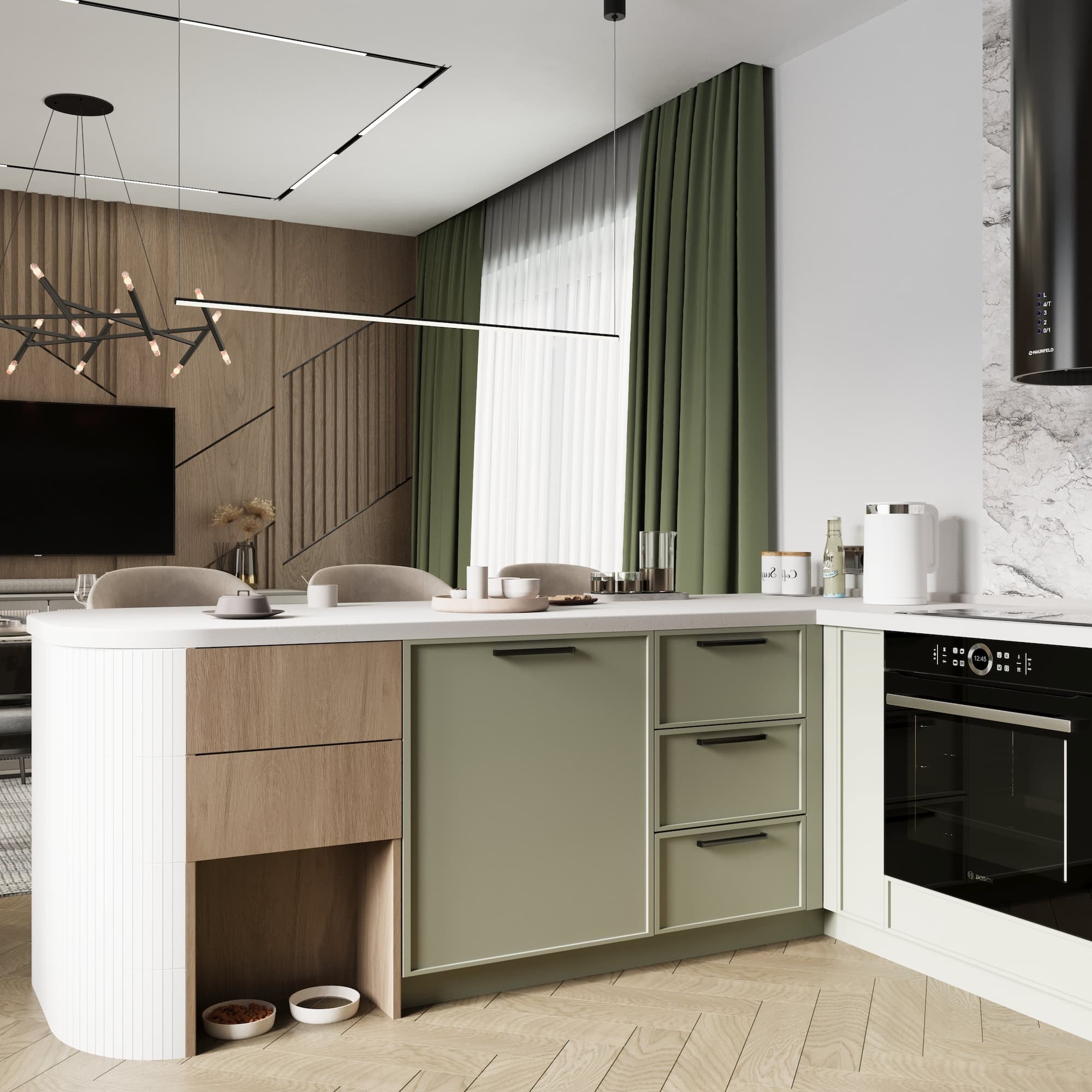 Особую атмосферу задают балки и стеновые панели, выполненные из шпона дуба, которые не только подчеркивают элегантность интерьера, но и добавляют ему тепла и уюта.
